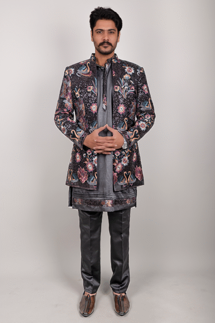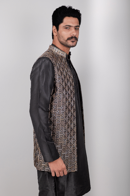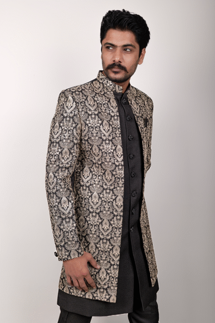 Black Jacquard & Velvet Indo Western with Multithread and Sequin Embroidery