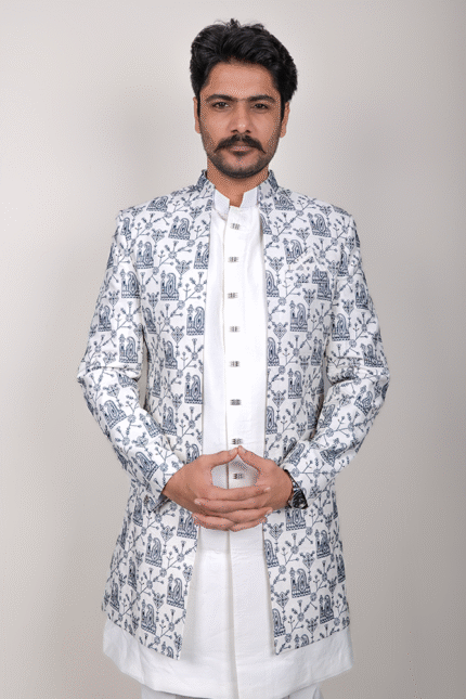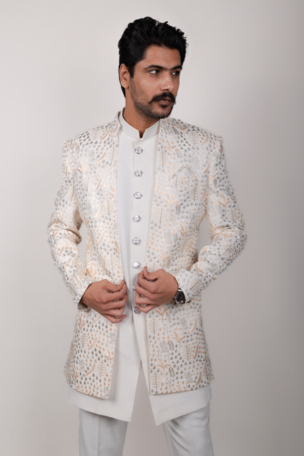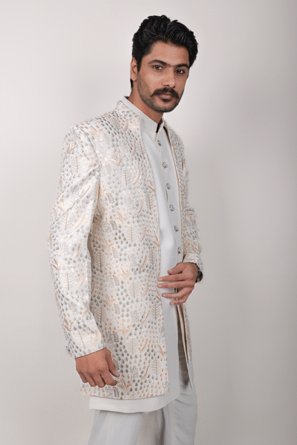 White Woven Jacquard Sherwani with Diamond, Pearl & Zardozi Embroidery