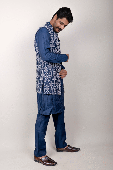 Dark Blue Chikankari Embroidered Kurta-Payjama Set with Jacket