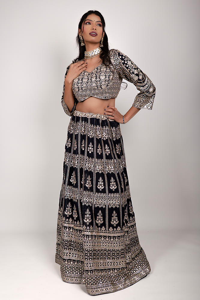 A luxurious black georgette crop top set featuring rich golden zari, dori, and sequin embroidery with a matching heavy border dupatta.