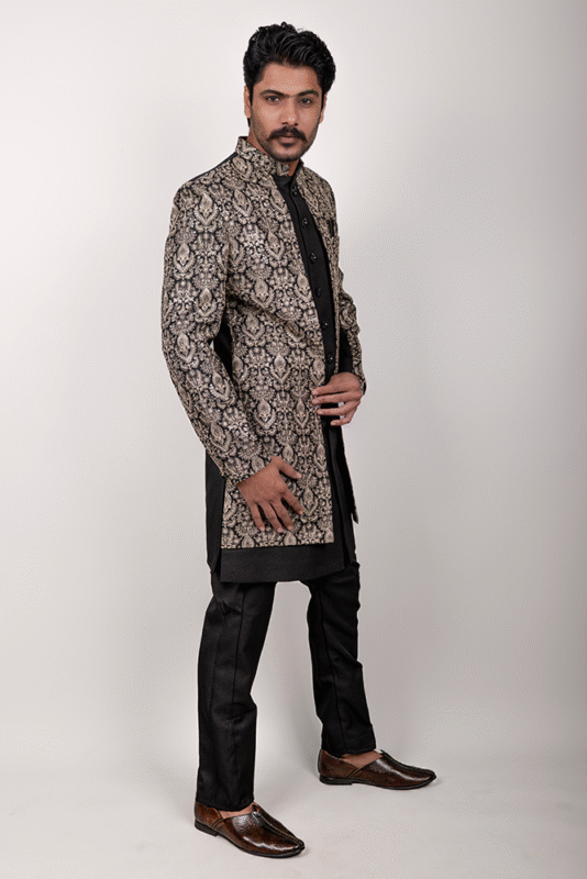 Black Jacquard & Velvet Indo Western with Multithread and Sequin Embroidery