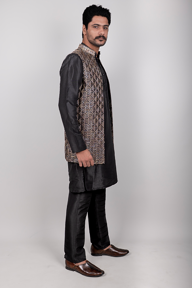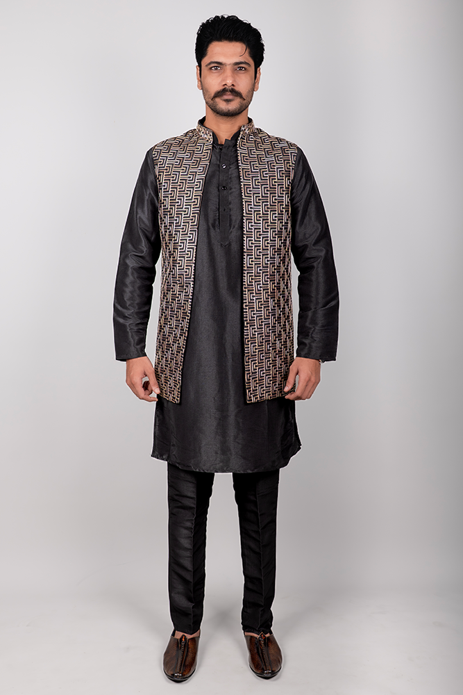 A sophisticated black silk kurta pajama set featuring striking gold and white geometric embroidery, combining regal elegance with modern design for festive and formal occasions.