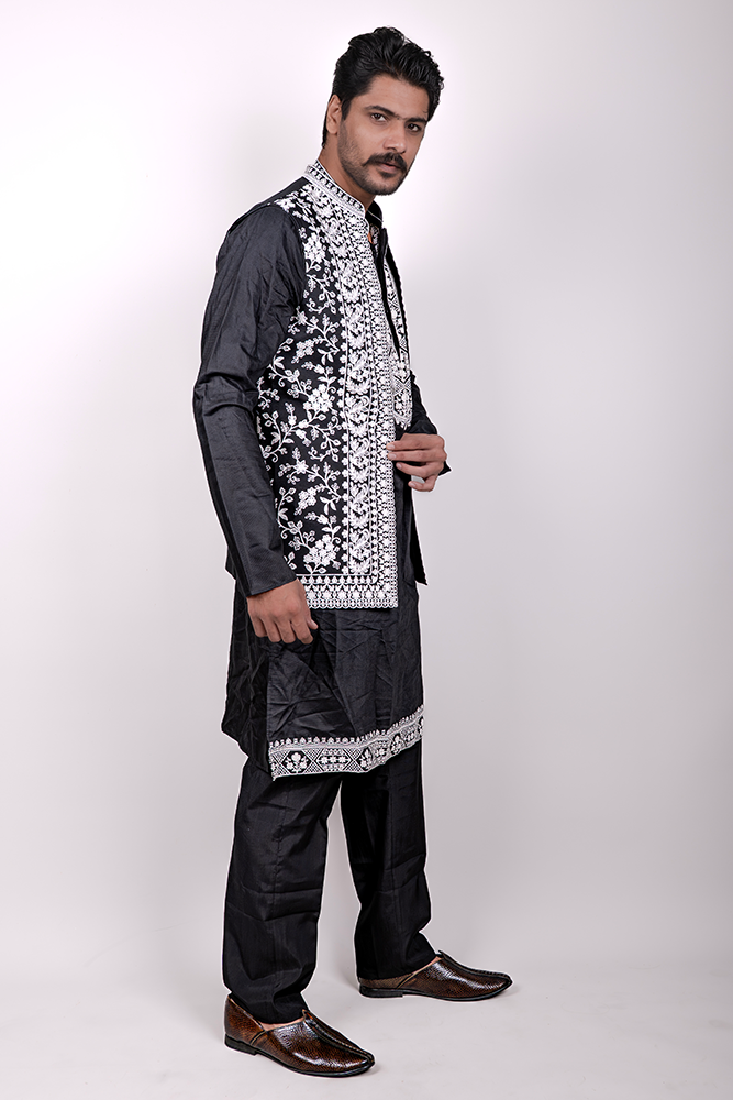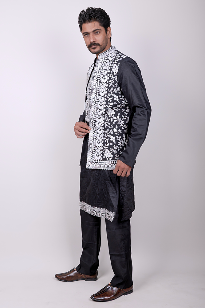 A refined black twill kurta-pajama set featuring elegant white Chikankari floral embroidery, paired with a matching embroidered jacket — an ensemble that blends traditional artistry with timeless sophistication.
