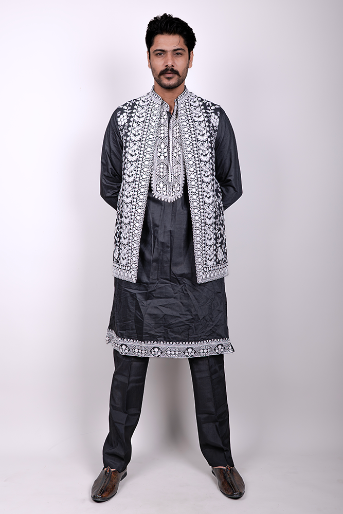 Design: Complete kurta-pajama set with a matching embroidered jacket, combining heritage artistry with modern sophistication.