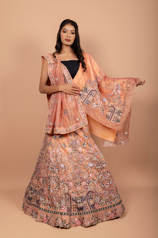 Embrace timeless sophistication with this exquisite Copper Colour Net Lehenga, designed for grandeur and celebration. The lehenga features a delicate net base richly adorned with hand-embroidered sequins and cutdana work, creating intricate patterns and a dazzling textured finish. A coordinated embroidered net blouse with a satin liner ensures both comfort and style, while the matching embroidered net dupatta adds grace and balance to the ensemble. Styled as a free-size lehenga, this piece offers versatile fitting and comfort without compromising on elegance. Perfect for weddings, reception and special events, this lehenga combines traditional artistry with contemporary appeal, making it a standout addition to any occasion wardrobe.