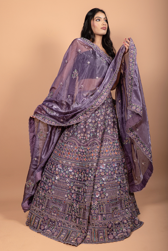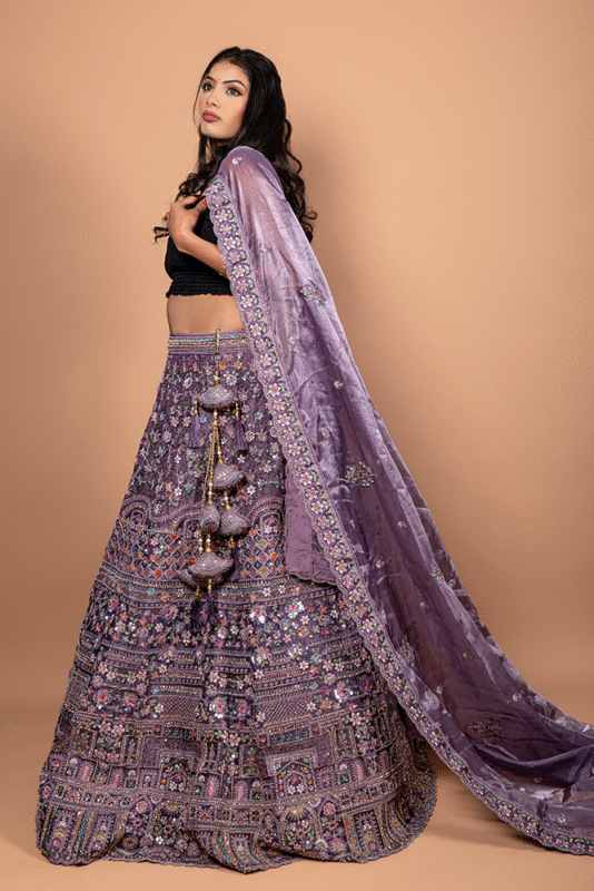 An elegant free-size copper lehenga crafted in net with intricate sequin and cutdana hand embroidery, paired with an embroidered blouse, satin liner, and net dupatta.