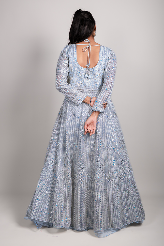 The set includes a grey satin skirt that offers a graceful, fluid drape and a finely embroidered shimmer organza dupatta, completing the ensemble with an ethereal glow. Available in M, L, and XL sizes, this outfit ensures a flattering fit while maintaining couture elegance.