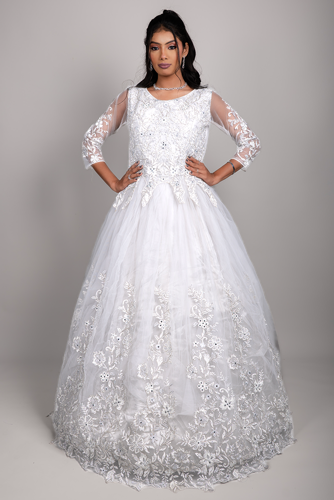 Step into timeless sophistication with this Greyish White Net Fabric Festive Gown, beautifully crafted for special occasions. The gown showcases a delicate net base enriched with floral embroidery, enhanced by sparkling diamond and sequin work that adds shimmer and depth to the design. The intricate detailing on floral appliqués creates a refined and grand event appeal, making it perfect for wedding receptions and grand celebrations. Designed in size L, this gown offers both elegance and comfort, ensuring a flattering fit. Ideal for wedding, reception and festive gatherings, and evening occasions, this gown combines modern style with traditional hand-embellished artistry for a truly enchanting look.