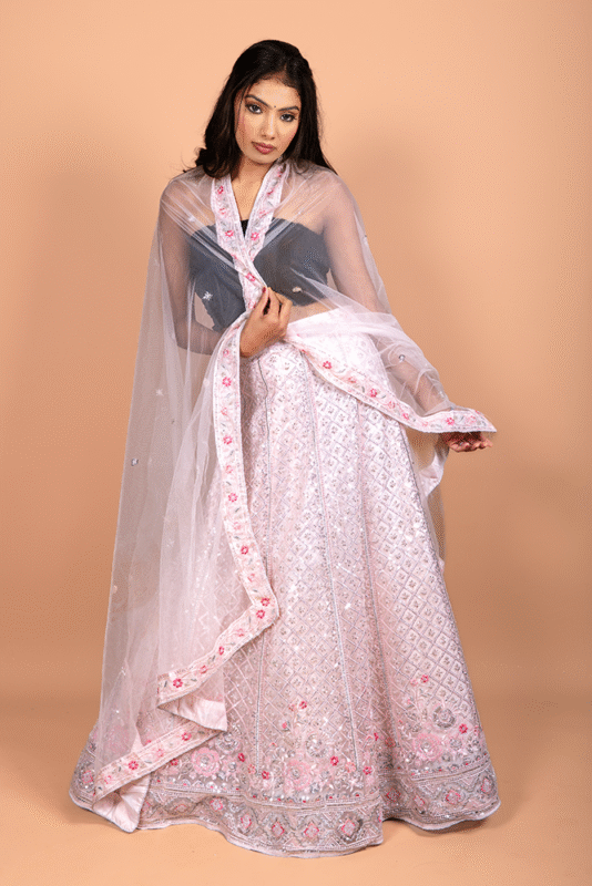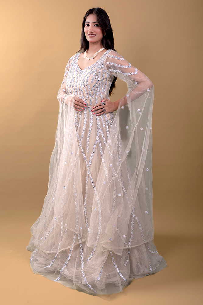 This Ivory Linen Wedding Gown is a vision of timeless elegance and intricate craftsmanship. Designed on a sheer ivory net base, the gown features exquisite silver thread embroidery beautifully accented with sequins, reflective mirrors, and shimmering beads. Delicate floral motifs in subtle shades of pink and green add a soft romantic touch, while crystal and diamond-style embellishments enhance its luxurious appeal. Perfect for modern brides or special wedding events, this gown exudes sophistication and poise. Available in XL size, it offers a flattering silhouette and a light, elegant drape that makes every movement enchanting.
