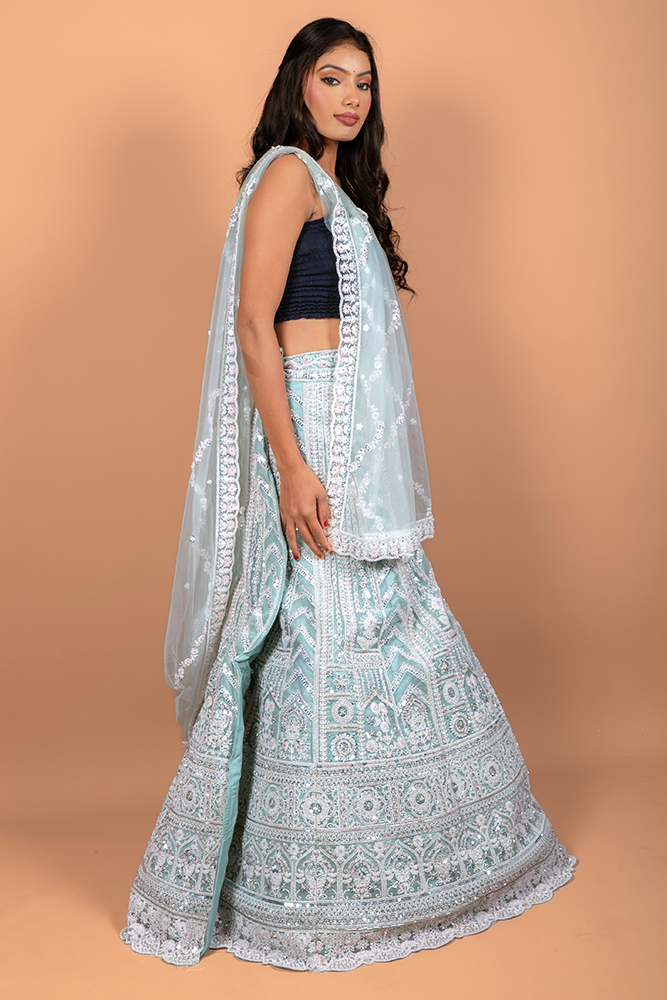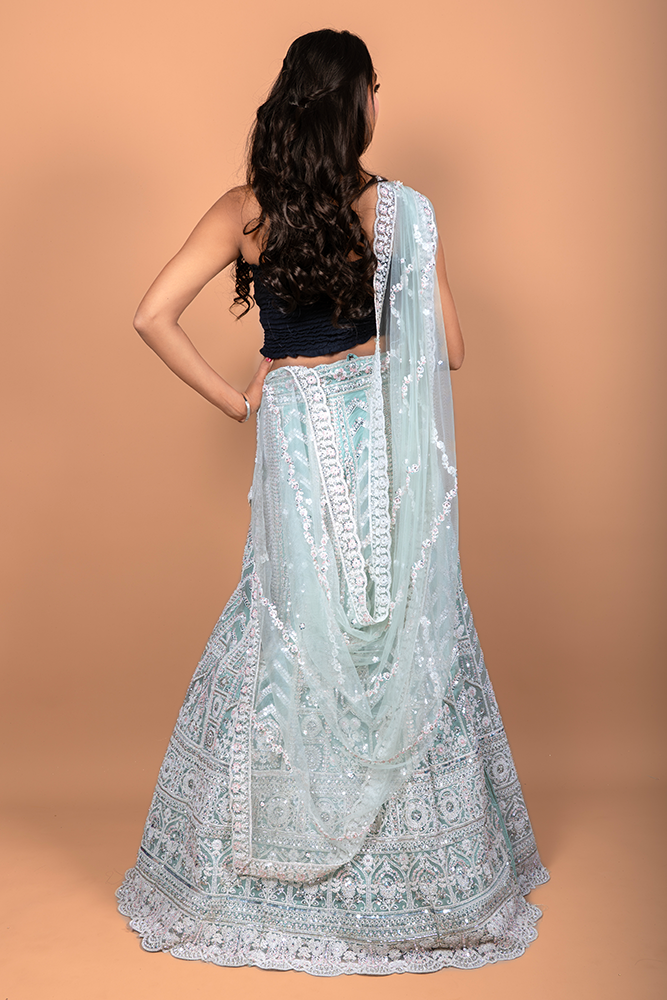 An elegant free-size pista green lehenga adorned with heavy silver sequin and bead embroidery, paired with a matching net blouse with liner and an embroidered dupatta.