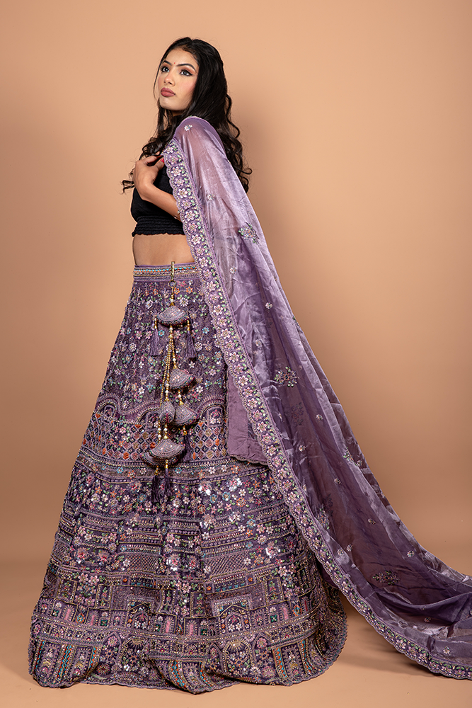 Drape yourself in royal elegance with this purple tissue silk lehenga, a masterpiece of intricate craftsmanship and luxurious design. The ensemble showcases heavy multicolor thread embroidery combined with zari and sequin embellishments, creating a radiant texture that captures light beautifully with every movement.