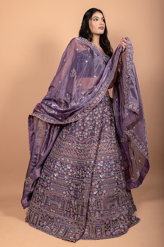 A majestic purple tissue silk lehenga richly adorned with multicolor thread and sequin embroidery, paired with an unstiched heavy-work blouse and embroidered dupatta — a perfect choice for grand weddings and festive occasions.