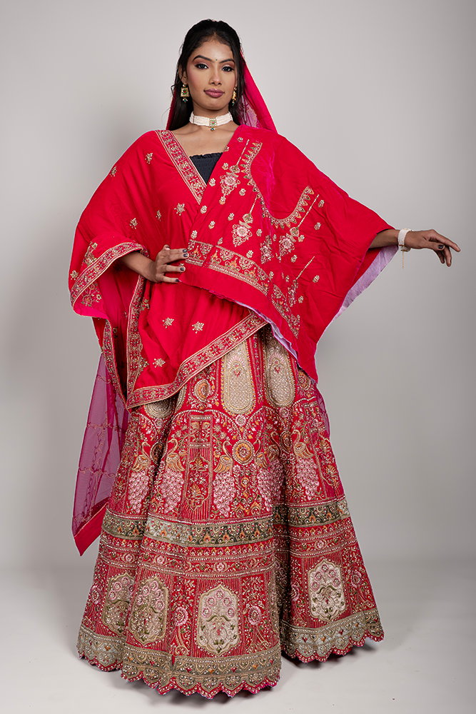 Embody regal splendor with this rani pink bridal velvet lehenga, a timeless masterpiece of traditional zardozi embroidery and diamond embellishment. Inspired by royal Indian craftsmanship, the ensemble showcases intricate metallic threadwork, highlighted with pearls, diamonds, and colorful thread detailing, creating a radiant fusion of tradition and luxury.