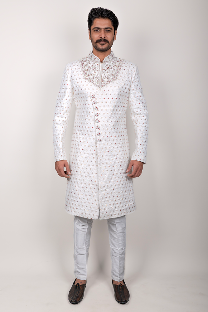 White Woven Jacquard Sherwani with Diamond, Pearl & Zardozi Embroidery