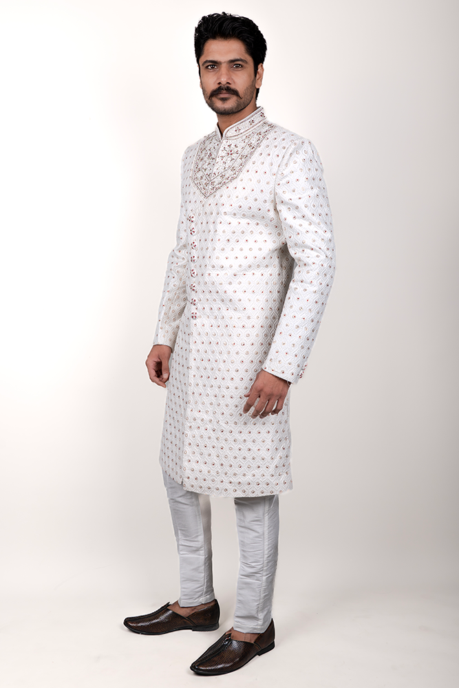 A majestic white jacquard sherwani intricately hand-embroidered with pearls, diamonds, and zardozi work in rich red and gold detailing — crafted for the modern groom with a royal taste.