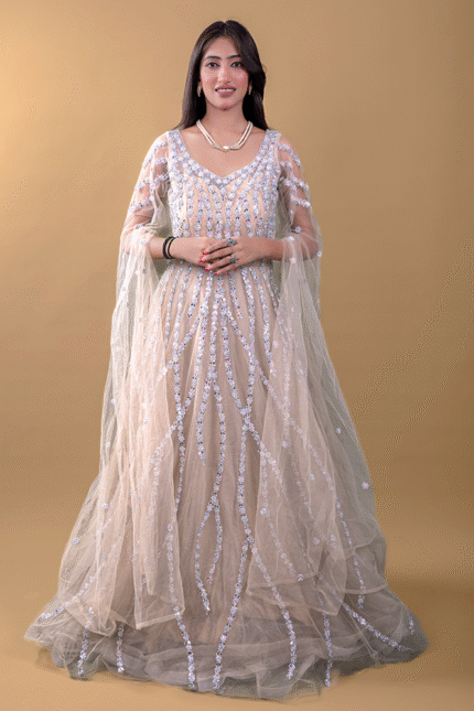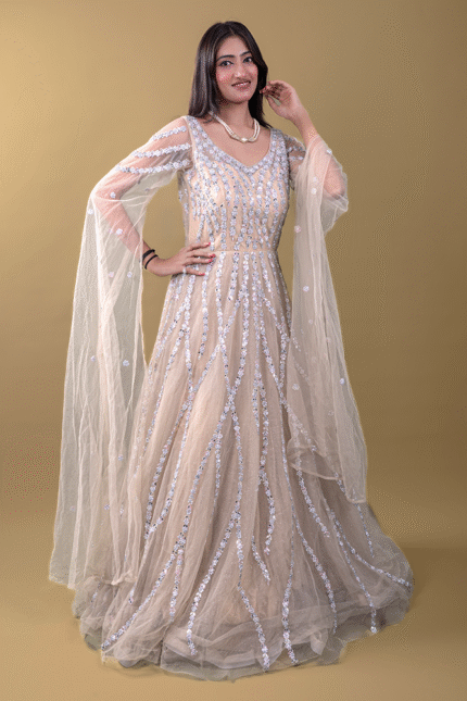 Cream-Offwhite Net Festive Gown with Floral Embroidery, Diamond & Sequin Work