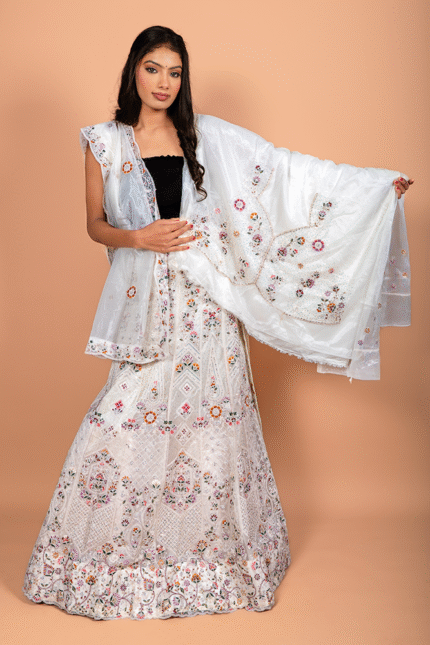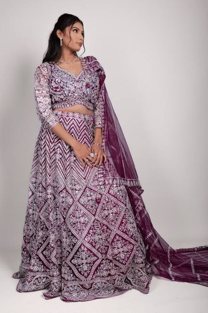 Lavender Shimmer Net Crop Top Set with Floral Embroidery and Diamond Thread Work