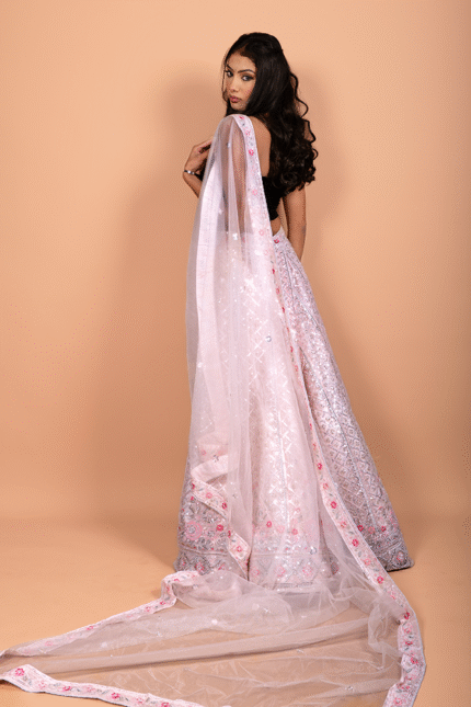 Pink Net Crop Top with Chikankari and Shisha Mirror Work Embroidery