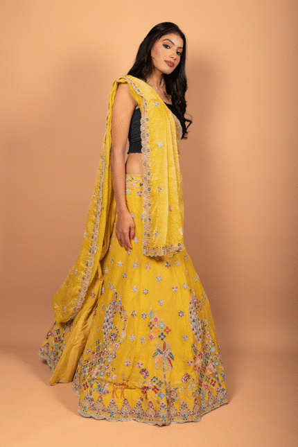 Yellow Golden Chanderi Silk Lehenga with Sequin Floral and Diamond Work Embroidery