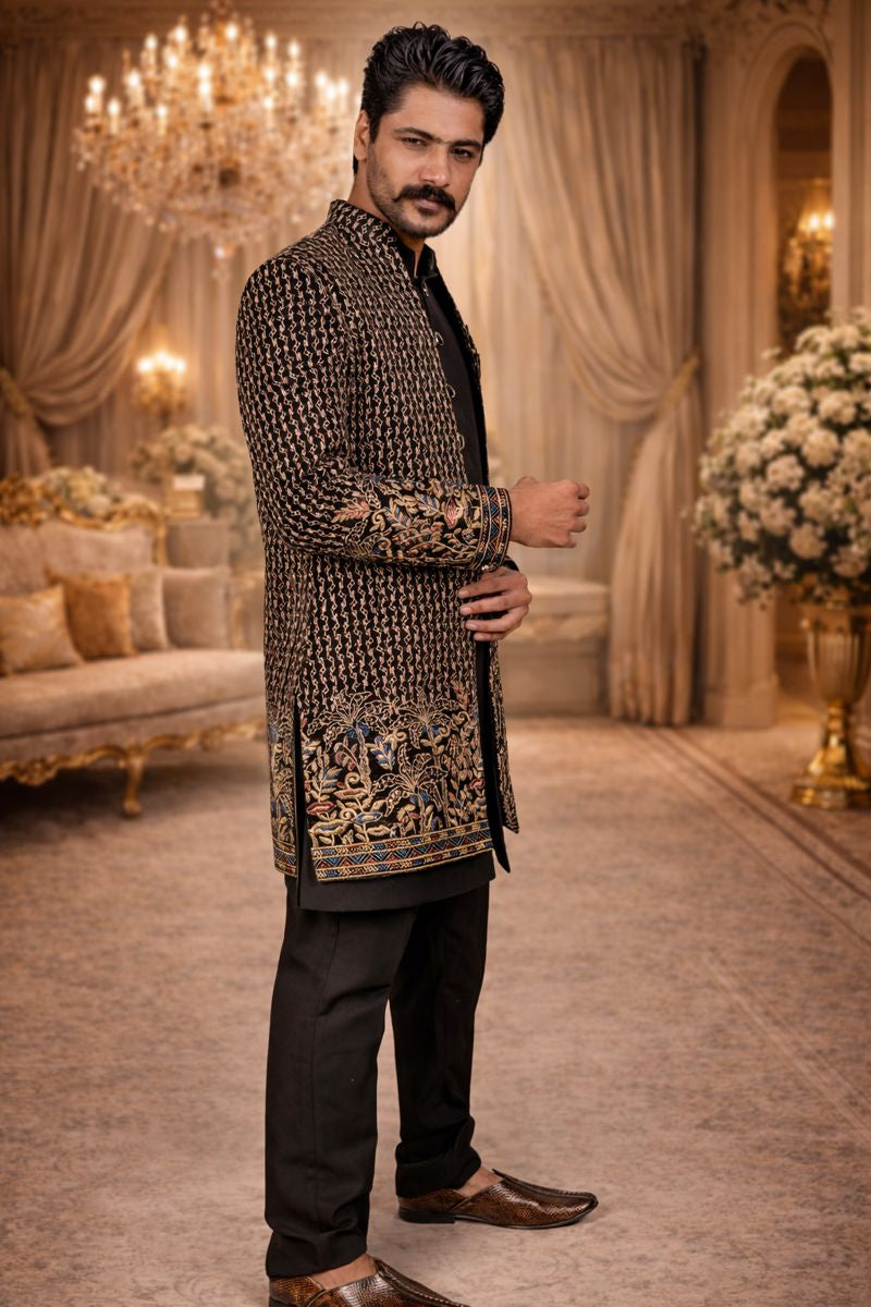 Black Jacquard & Velvet Indo Western with Multithread and Sequin Embroidery
